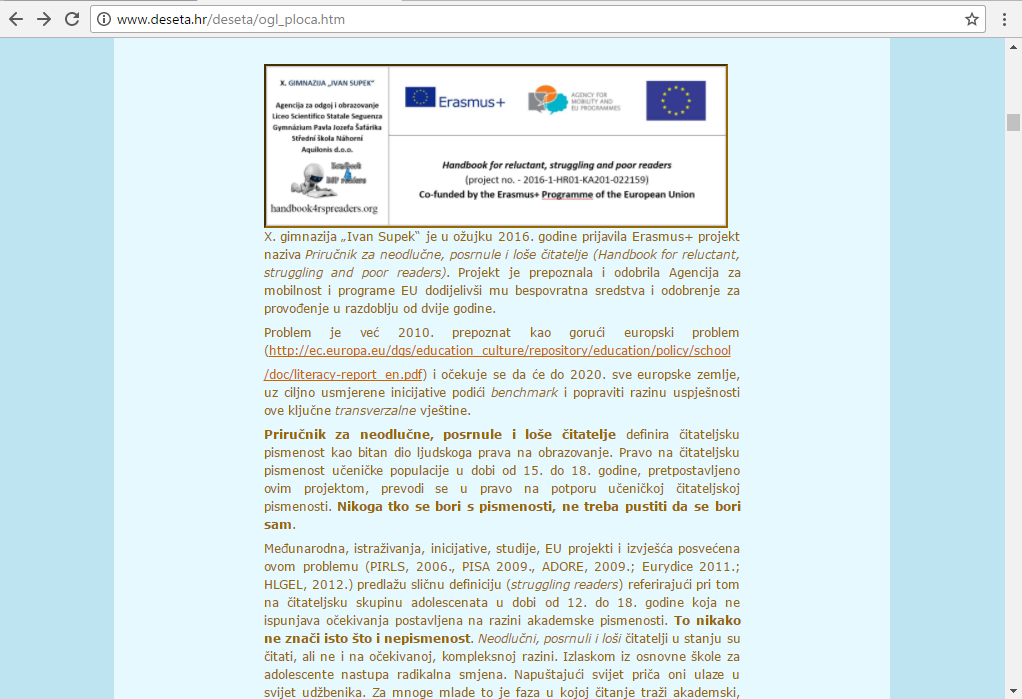 Na poziv voditeljice projekta, Jelene Crnek, prof. X. gimnazije "Ivan Supek" Zagreb, učenici 2.e razreda II. GIMNAZIJE Split pod vodstvom profesora Borisa Škifića sudjelovali su u istraživačkom dijelu programa Erasmus+ u projektu Priručnik za neodlučne, posrnule i loše čitatelje (Handbook for reluctant, struggling and poor readers).